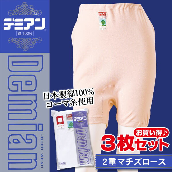 関連シリーズ↓2重マチズロース(M〜LL)「品番:442390」2重マチズロース(3L)「品番:319970-01」2重マチズロース 3枚セット(M〜LL)「品番:990130」2重マチズロース 3枚セット(3L)「品番:319970-s」デミアン 綿100% コーマ糸使用 2重マチズロース 3枚セットの詳細商品名デミアン 綿100% コーマ糸使用 2重マチズロース 3枚セット対象者レディーズサイズM(ヒップ:87-95)L(ヒップ:92-100)LL(ヒップ:97-105)カラー白/ピーチ素材・加工綿100%コーマ糸使用生産国日本製(MADE IN JAPAN)関連キーワードレディース/婦人/女性/ミセス/肌着/下着/デミアン/Demian/綿100%/綿/コットン100%/コーマ糸/日本製/吸湿性/ムレ/442390/442391/442392デミアン 綿100% コーマ糸使用 2重マチズロース 3枚セット M〜LL 綿100%コーマ糸を使用している「Demian(デミアン)」インナーシリーズ。