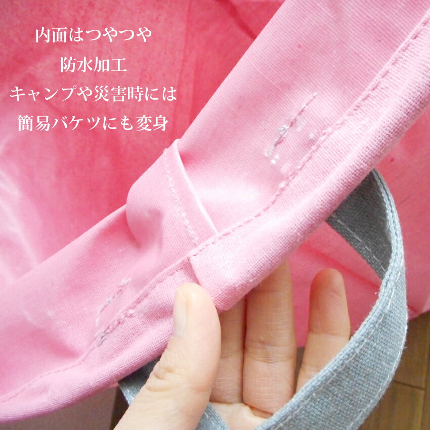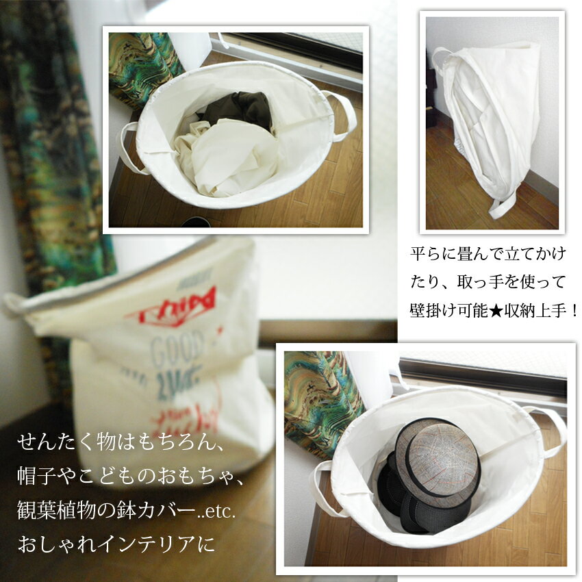 ■製品説明 洗濯籠もおしゃれインテリアに! 使わない時はくしゃっと畳んで収納便利取っ手を使えば、壁掛けやベランダ、お部屋にかけられるので、場所をとらないよ! 内側生地は防水加工で、洗濯物はもちろん、キャンプや災害時の簡易バケツにも使えるすぐれもの! お子様のおもちゃや、観葉植物の鉢カバー、買い置きの食品、、用途はいろいろ♪