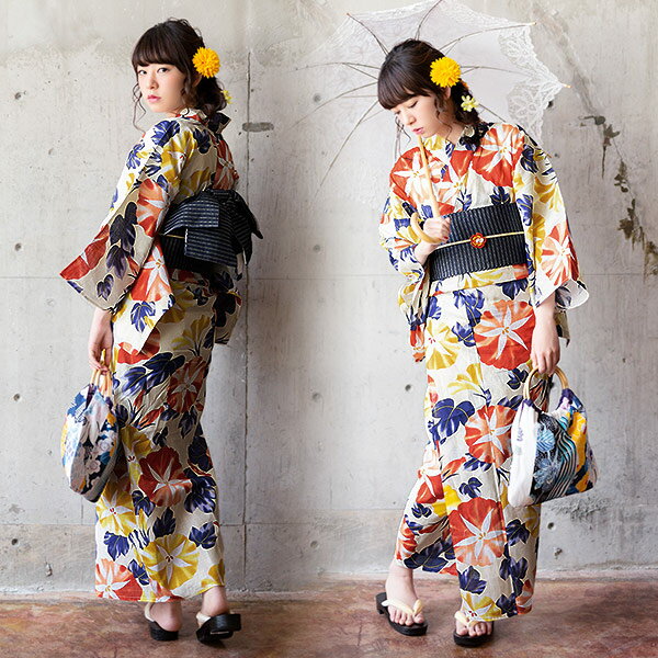 【商品内容】浴衣、帯、下駄の計3点【色柄】浴衣:生成り地に黄色と朱赤の大きな朝顔。