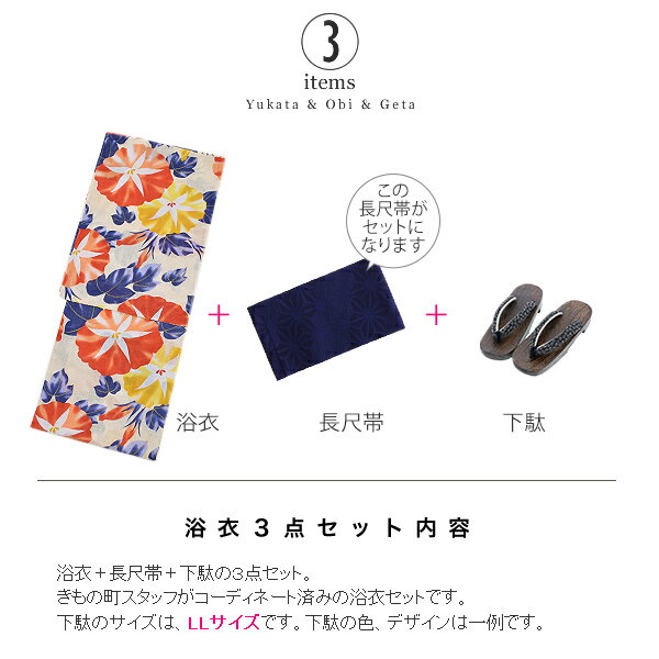 【適応ヒップサイズの目安(浴衣)】 3L---ヒップ約110〜120cm 4L---ヒップ約130cmくらいまで 【下駄のサイズにつきまして】 履いた時に台からかかとが少しはみ出るくらいまでのサイズが適応サイズです。