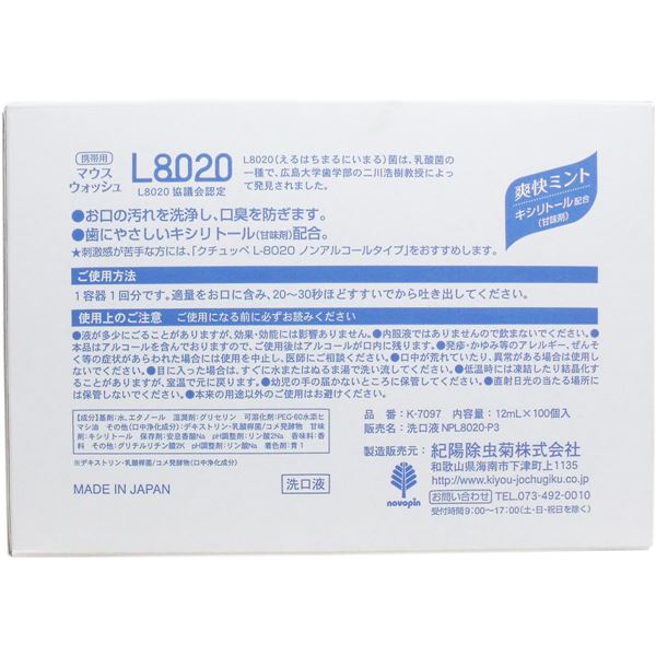 クチュッペ L-8020 マウスウォッシュ 爽快ミント ポーションタイプ 100個入●L8020乳酸菌配合(※デキストリン・乳酸桿菌/コメ発酵物(口内浄化成分))マウスウォッシュ●お口清潔、毎日の歯磨きの後は乳酸菌パワーでクリアな息●お口の汚れを洗浄し、口臭を防ぎます。
