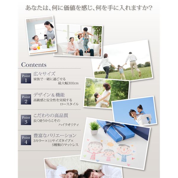 家族で一緒に過ごす・LEDライト付き高級ローベッド【Yugusta】ユーガスタマットレス最大幅300cm、 品質保証1年付き あなたは、何に価値を感じ、何を手に入れますか? ContentsPoint1 広々サイズ家族で一緒に過ごせる最大幅300cmPoint2 デザイン&機能高級感と安全性を実現するロースタイルPoint3 こだわりの高品質長く使うからこそのハイクオリティPoint4 豊富なバリエーション3カラー×11サイズタイプ×5種類のマットレス大切な人と、1番長く過ごす場所。