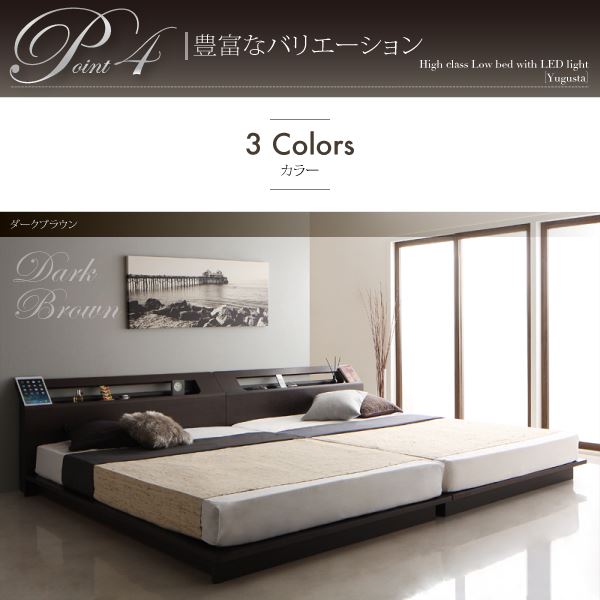 家族で一緒に過ごす・LEDライト付き高級ローベッド【Yugusta】ユーガスタマットレス最大幅300cm、 品質保証1年付き あなたは、何に価値を感じ、何を手に入れますか? ContentsPoint1 広々サイズ家族で一緒に過ごせる最大幅300cmPoint2 デザイン&機能高級感と安全性を実現するロースタイルPoint3 こだわりの高品質長く使うからこそのハイクオリティPoint4 豊富なバリエーション3カラー×11サイズタイプ×5種類のマットレス大切な人と、1番長く過ごす場所。